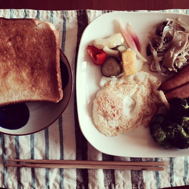 常備食をいっぱい作ってから朝食がらくちん。 しかし、目玉焼き失敗するかね。。 竹村真奈
